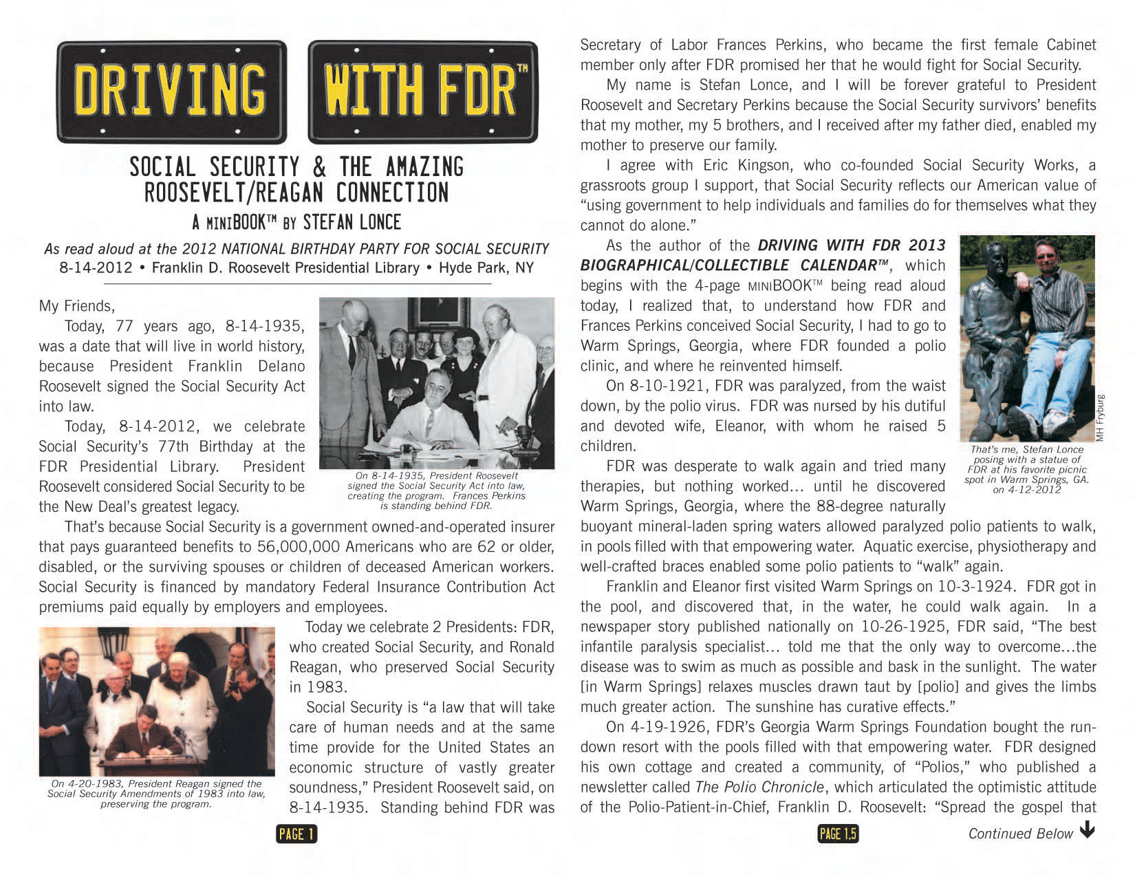 The DRIVING WITH FDR 2013 COLLECTIBLE CALENDAR measures 8.5" x 11" includes a free 4-page MINIBOOK, SOCIAL SECURITY & THE AMAZING ROOSEVELT/REAGAN CONNECTION, which was read aloud at the Franklin D. Roosevelt Presidential Library (Hyde Park, NY) on 8-14-2012.